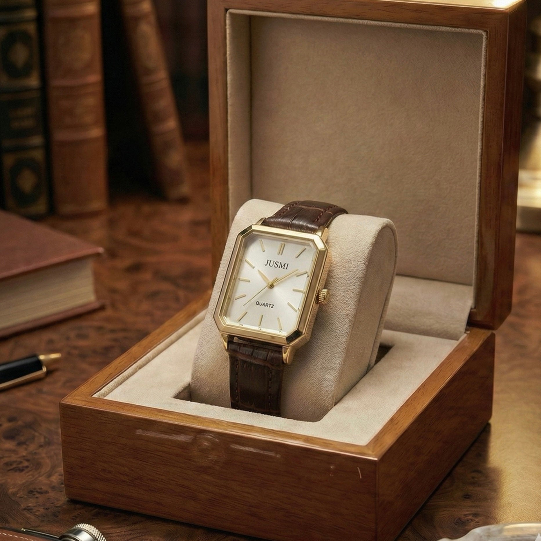 A rectangular watch with a classic style and a crocodile-effect leather strap. The Roman numeral dial adds a touch of professional elegance. An ideal watch for a serious and timeless look.
