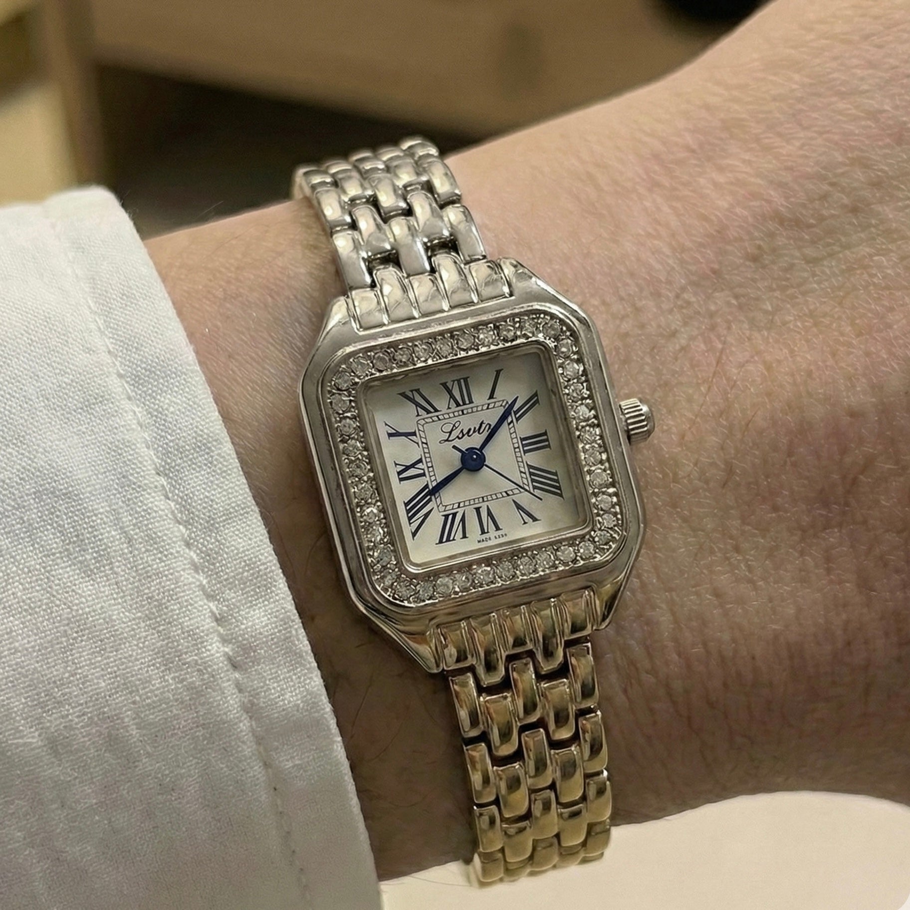Un modèle argenté au style luxueux et intemporel. Son bracelet tressé en acier poli reflète la lumière à chaque mouvement. Le cadran rectangulaire, orné de chiffres romains, évoque un style classique et chic.